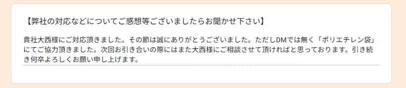 貴社大西様にご対応頂きました。その節は誠にありがとうございました。ただしDMでは無く「ポリエチレン袋」にてご協力頂きました。次回お引き合いの際にはまた大西様にご相談させて頂ければと思っております。引き続き何卒よろしくお願い申し上げます。