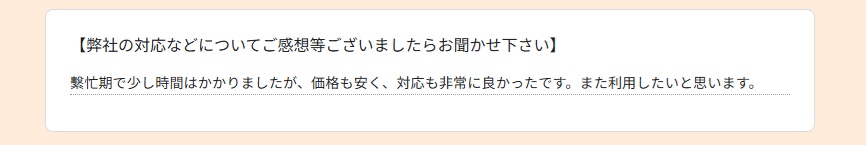 繫忙期で少し時間はかかりましたが、価格も安く、対応も非常に良かったです。また利用したいと思います。