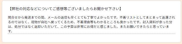 問合せから発送までの間、メールの返信も早くとても丁寧でよかったです。不着リストとしてまとまって返還されるのではなく、現物が自社へ戻ってくるため、不着理由等もわかるところも良かったです。封入資料が余った分は、処分ではなく返却いただいて、この予算は非常にお得だと感じました。またお願いできたらと思っています。